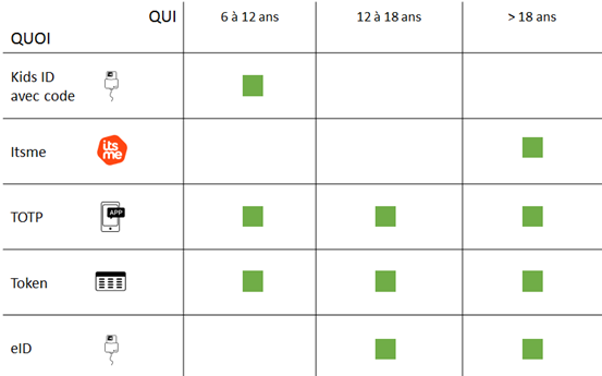 Le schéma présente les différentes façons de se connecter à l’application MyBEnefits en fonction de son âge. Pour les < 6 ans, il n’y pas de moyen de connexion approprié mais la gratuité est souvent pratiquée.